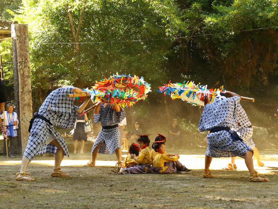 竹田市・宮山大歳神社の秋季大祭で、お神輿の通る道を払い清め、悪霊を追い払う重要な役を務めます。日本芸能の中で最も古く日本各地に残る獅子舞の中でも、三宅獅子は先導する団扇や太鼓、笛などの多様な役を必要とする賑やかな獅子舞です。岡本地区の人々によって世代を超えて大切に受け継がれ、絆を強めています。