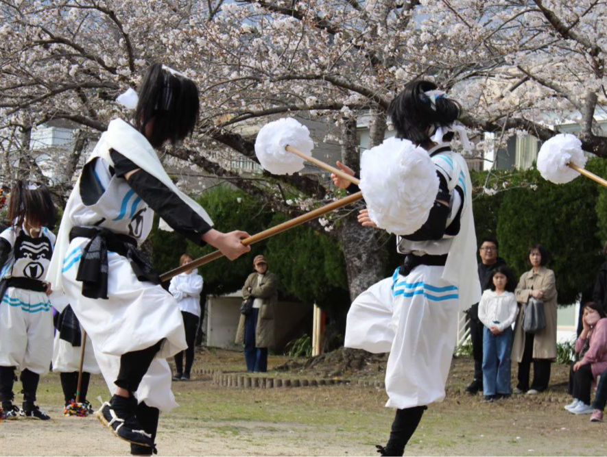 飾りつけた長い棒を、打ち合ったり、受身をとったりと緩急様々な技が見どころ。臼坪杖踊りは、江戸時代に五所明神社で奉納されたことに始まります。もともとは武士が教えた「棒術」が由来で、とくに県南地域では武術に近い意識で演じられるのが特徴。小学生から高校生までの子どもたちによるフレッシュで勇壮な動きにご注目ください。