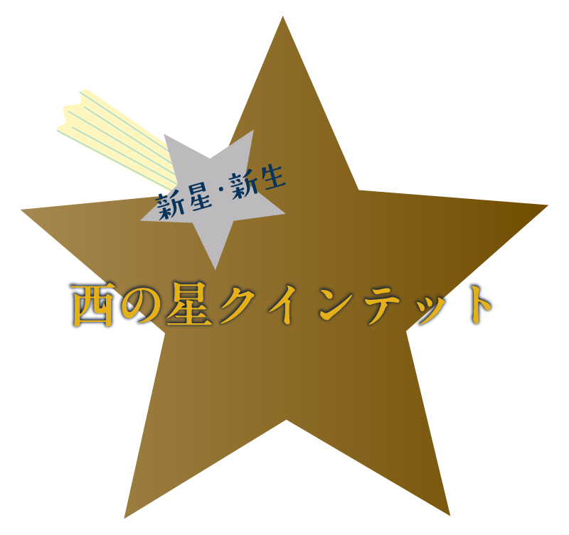 この五重奏の名称を、全員が大分うまれであること、‘5’を結ぶと★になること、大分麦焼酎 「西の星」を愛飲していることにちなみ「西の星クインテット」と命名しました(三和酒類公認)!