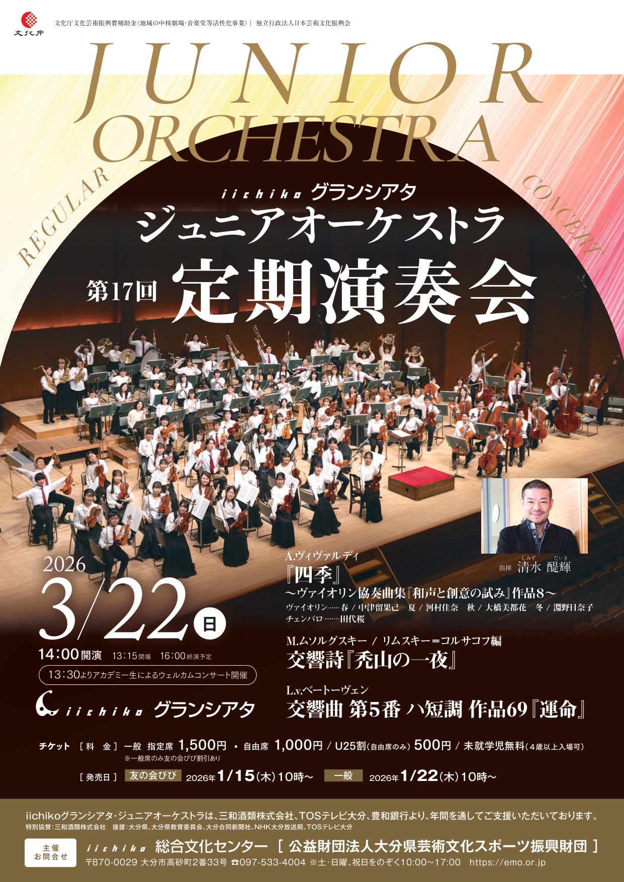2009年4月に結成したiichikoグランシアタ付属の大分県内唯一のジュニアオーケストラ。小4から22歳までのメンバーが在籍し、真のアンサンブル精神と豊かな感性を磨いている。毎春の定期演奏会のほか、市外コンサート(’25年はパトリア日田)などでも演奏。大分県立芸術文化短期大学を中心とした地元講師陣をはじめ、多数のプロオーケストラより一流の演奏家を招聘し、指導を受けている。これまで、指揮者に下野竜也、梅田俊明、船橋洋介等の各氏を、ソリストとして小林道夫、渡邊智道、宇野健太、水谷晃、前田健治各氏を招聘している。