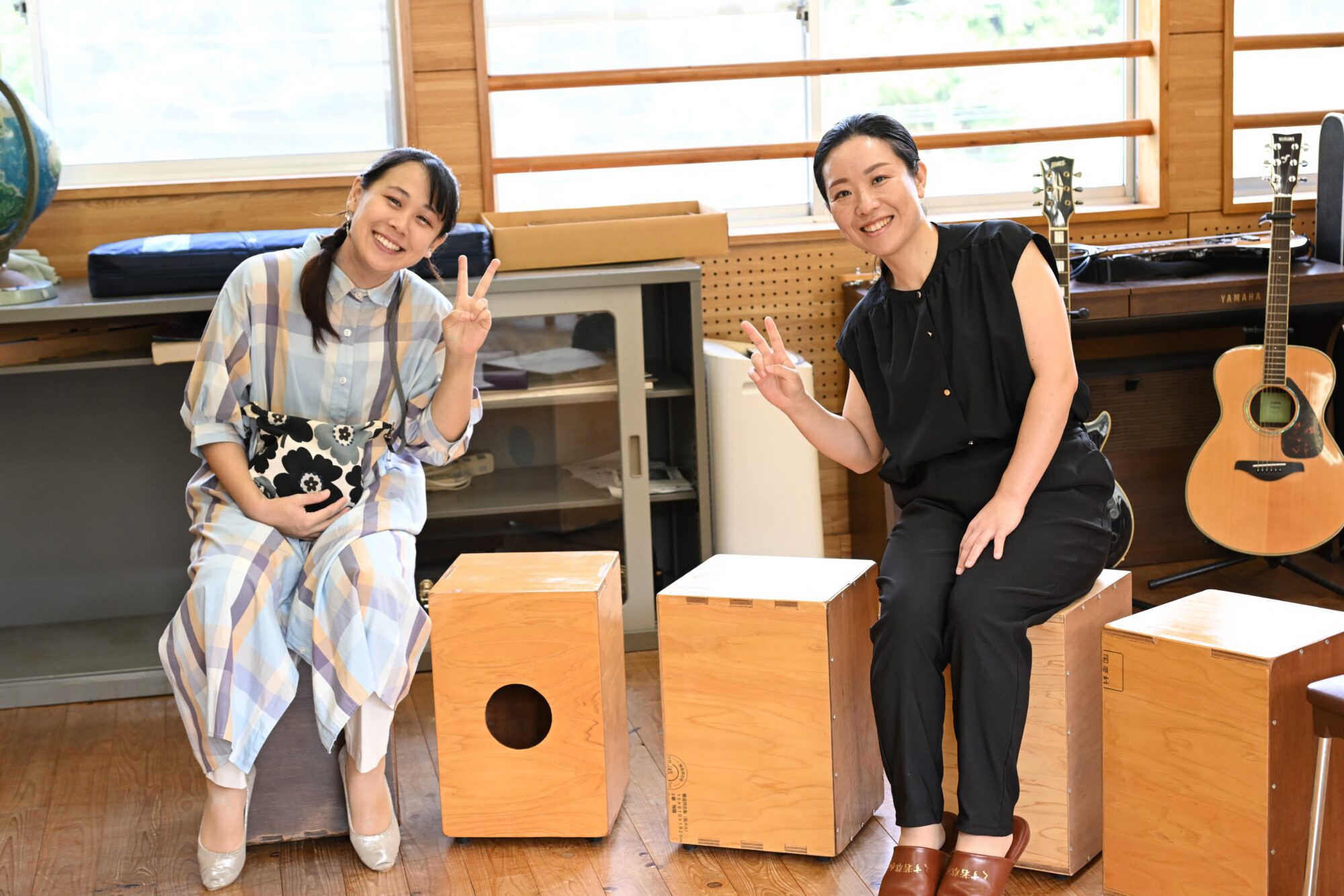 今回の会場は、リラックスルーム(音楽室)。楽器がたくさん置いてあり、なんと児童・生徒のみなさんが作ったカホンが椅子として置いてありました。