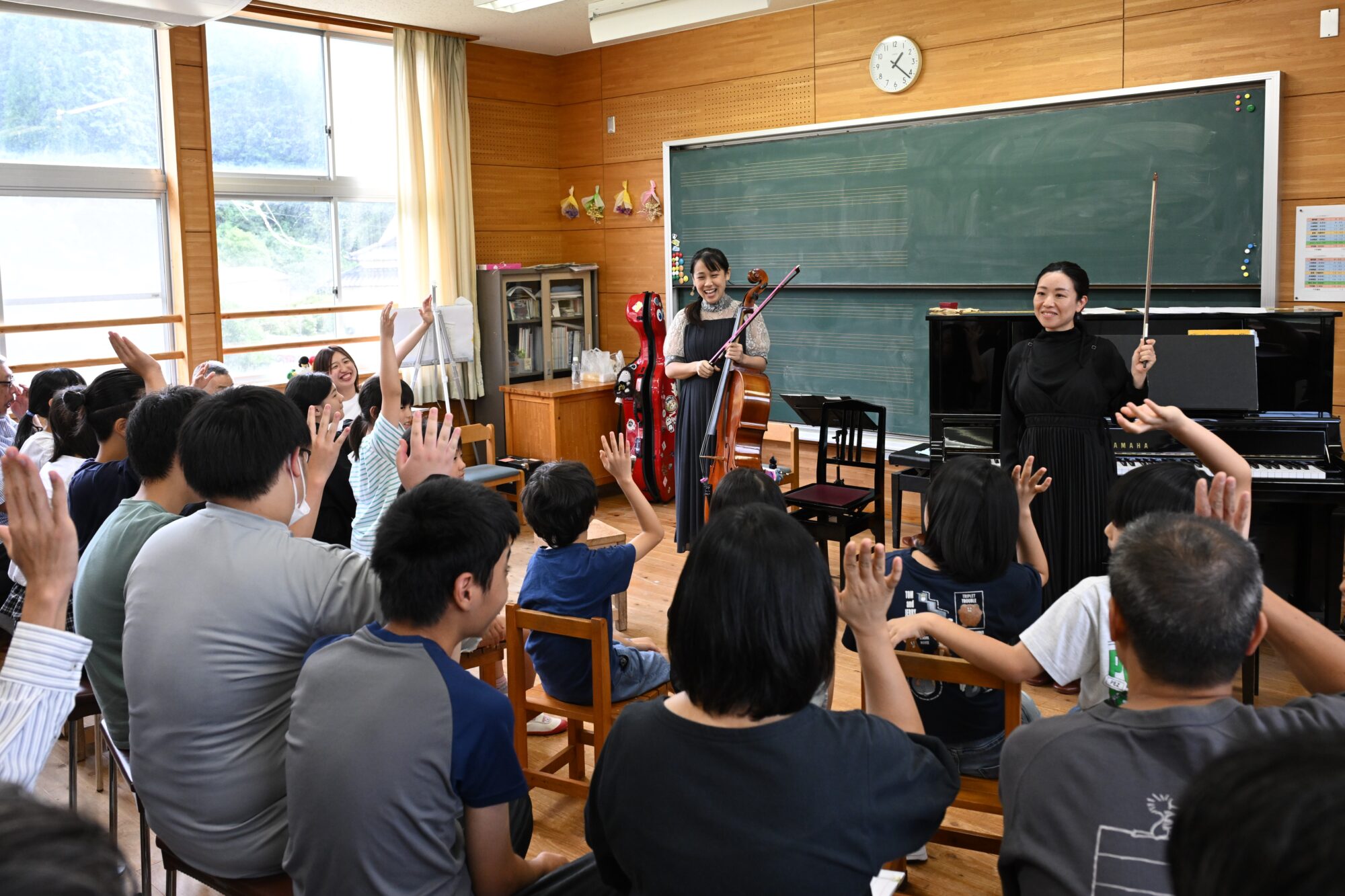 祖母の家が玖珠にあるため、昔から馴染みのある土地でおでかけクラシックコンサートを行うことができ、とても嬉しかったです。学校に到着し、楽器ケースを持って歩いていると、元気の良い子どもたちが「なにこれ!でっかい!」と興味津々に声をかけてくれたので、楽器の音を聴いたらどんな反応をしてくれるのかとても楽しみになりました。
