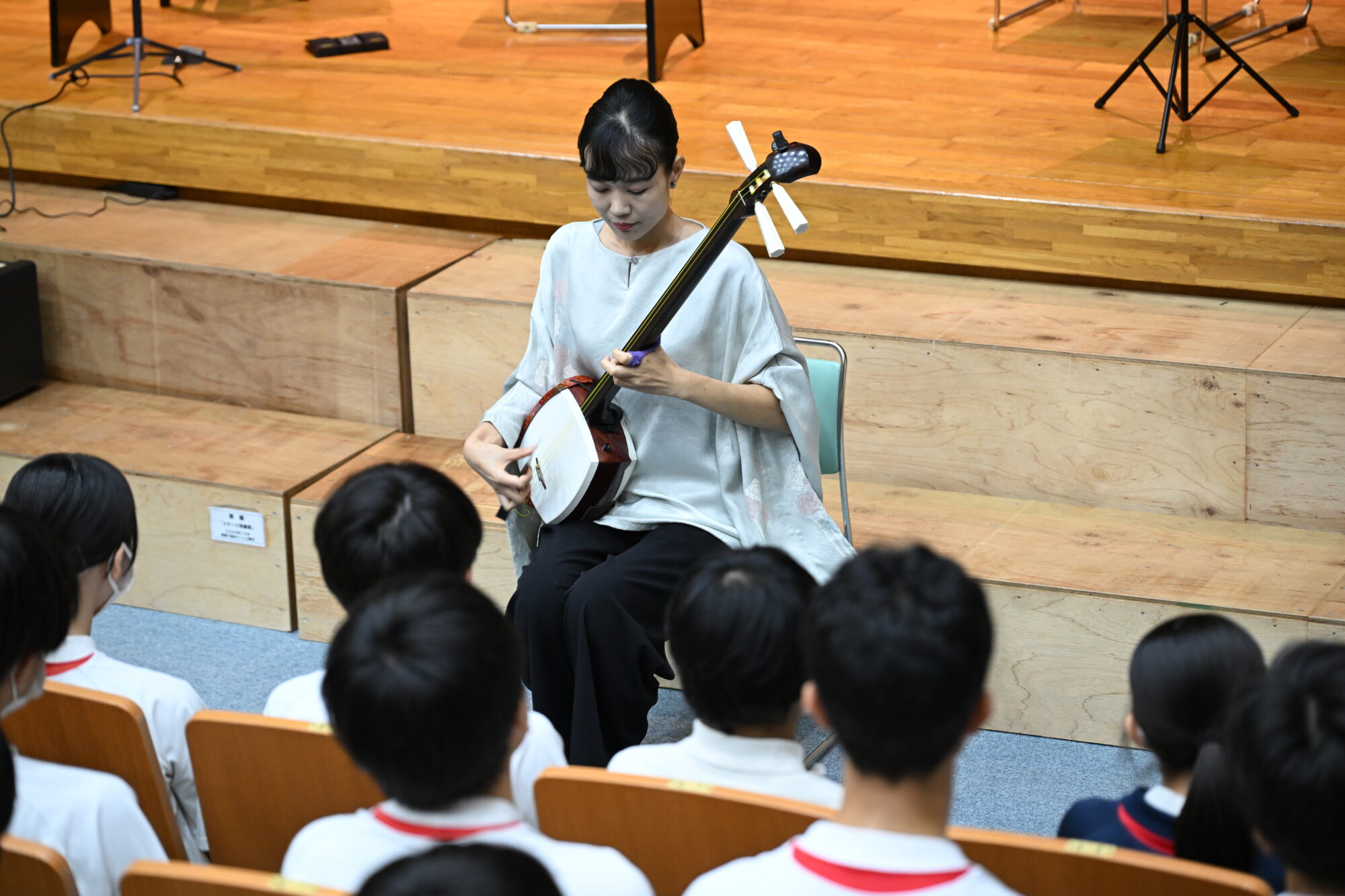 最初に2人でソーラン節の演奏で始まり、続いて箏と三味線の独奏へ。途中で五線譜とは異なる和楽器の楽譜の紹介をしながら、演奏を聴いてもらいました。