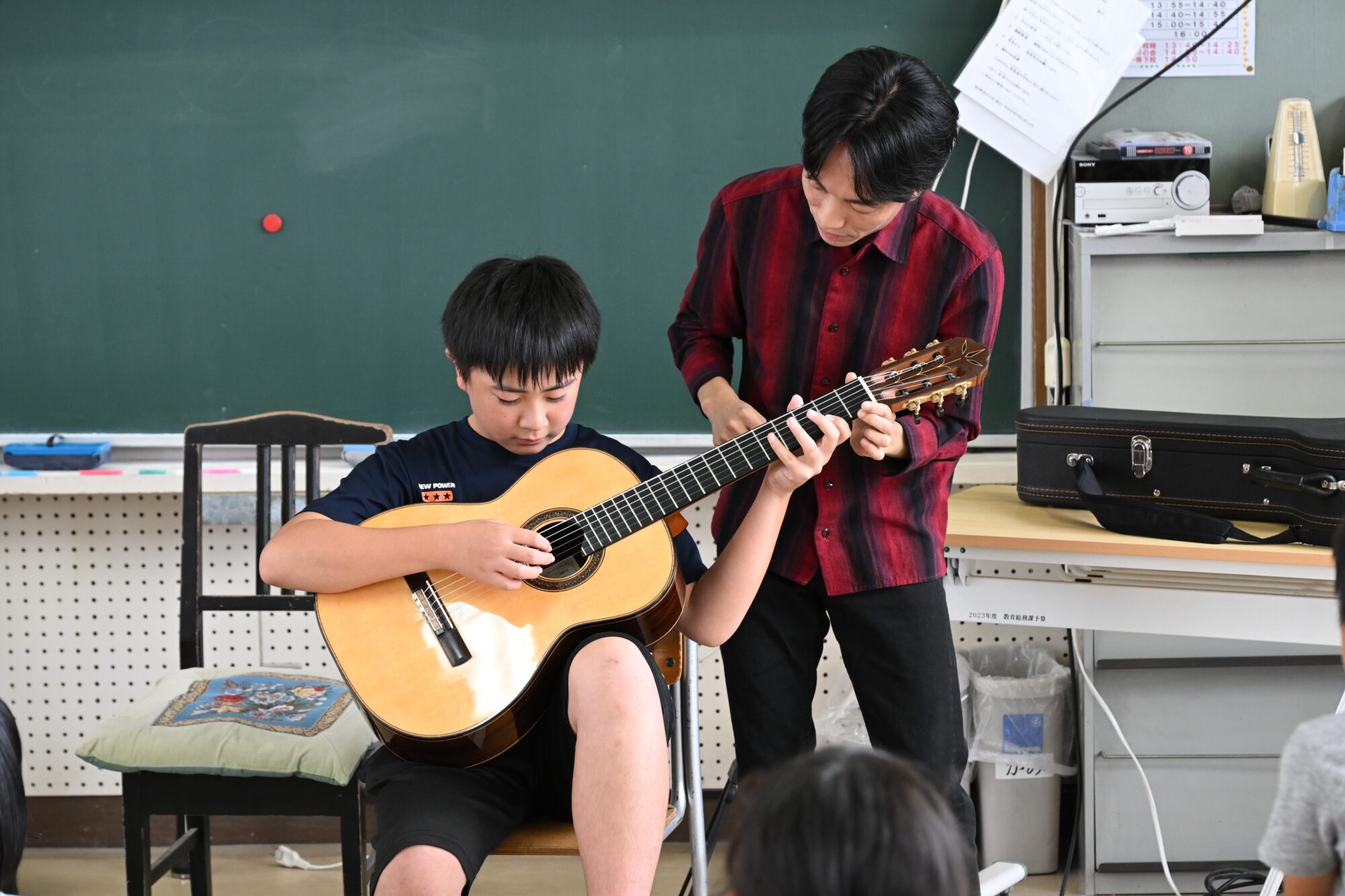 また今回は2人の子に楽器体験をしてもらいました。2人とも緊張した面持ちでギターを構えていましたが、左手の弦の押さえもしっかりしていて、右手で弾いた時にはとても綺麗な音が出ていました。