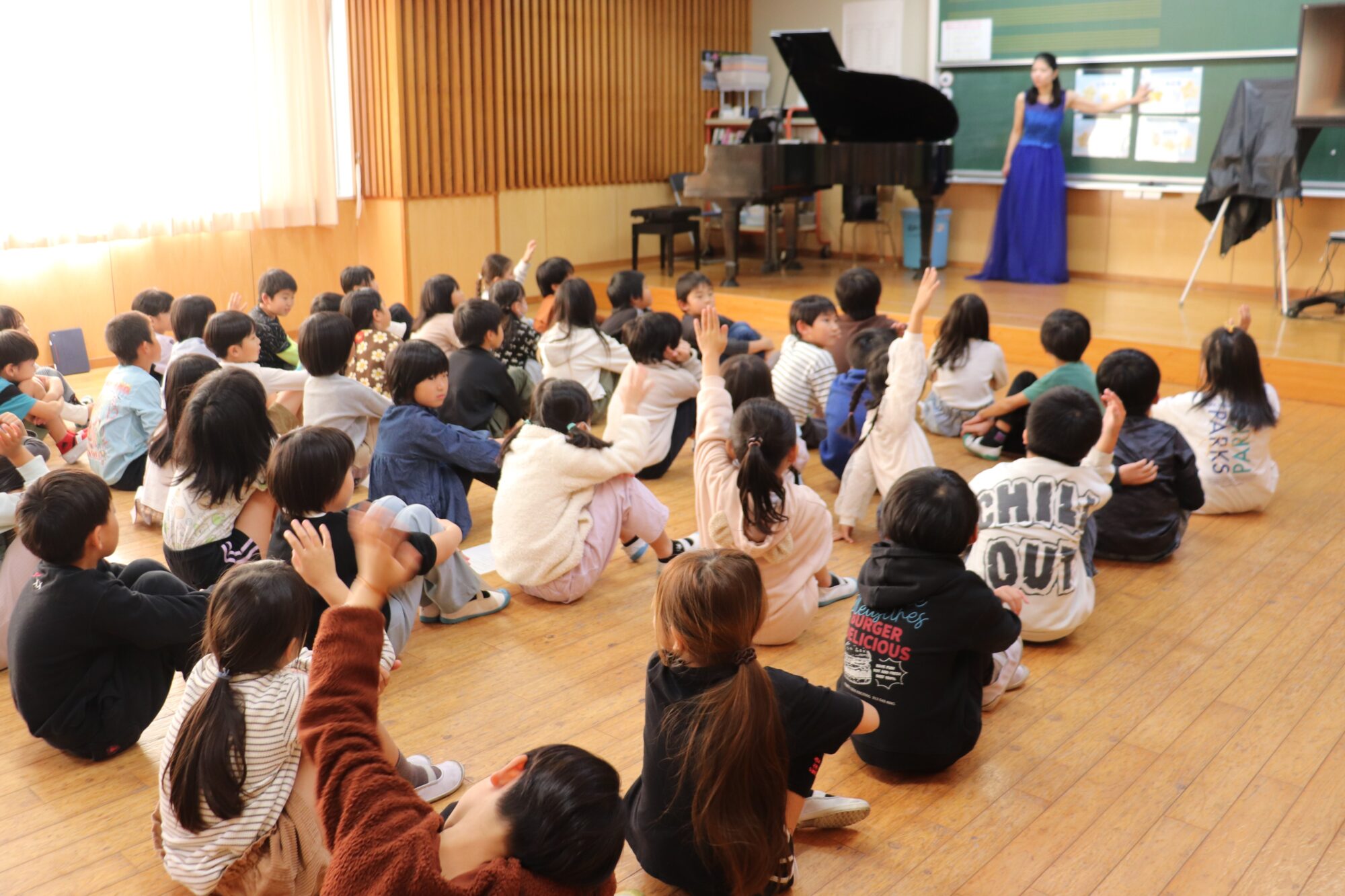 佐伯市立鶴岡小学校の2年生、53名を対象に、音楽室でコンサートさせていただきました。演奏者として、