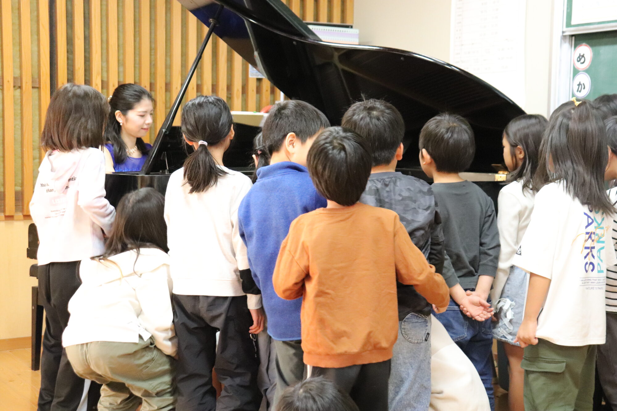 また、普段出来ない経験をして欲しいと考え、皆さんにかわるがわるピアノの下に潜ってもらいました。音の大きさと振動に対する、素直で可愛らしい驚きの反応を間近で見ることができ、皆さんのお顔を見ながら演奏できる喜びも再認識しました。