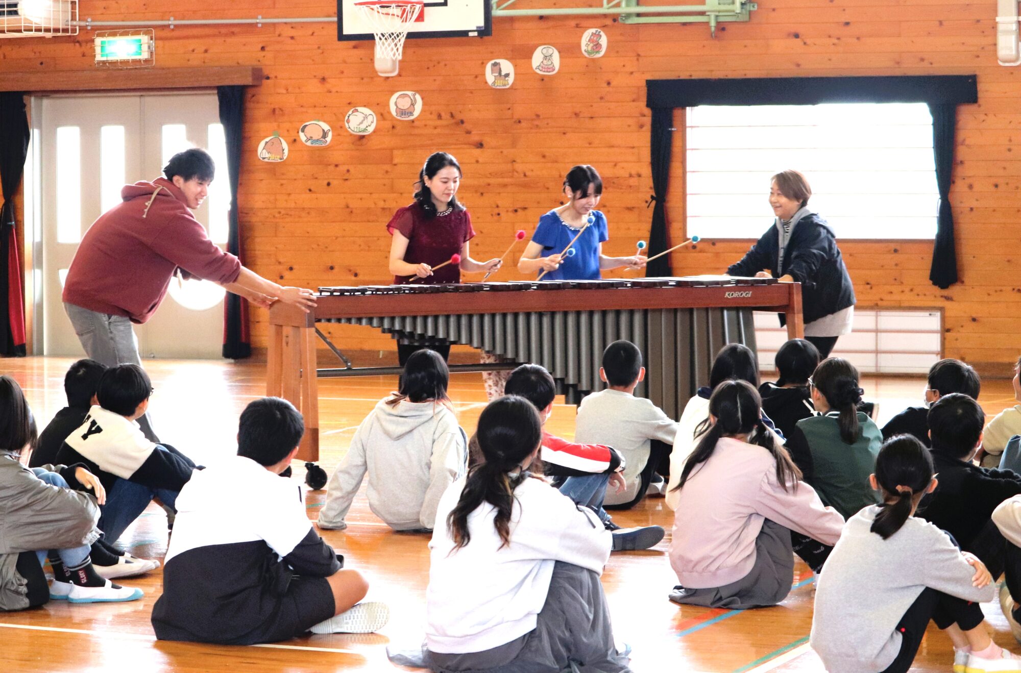 児童のみなさんは始まる前からとても静かに待っていてくれたようで、裏で待機していると、「この大きな楽器の名前はなんでしょう??」と先生の声掛けが聞こえてました。