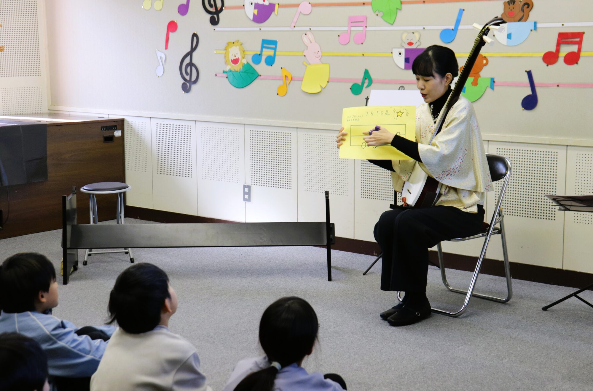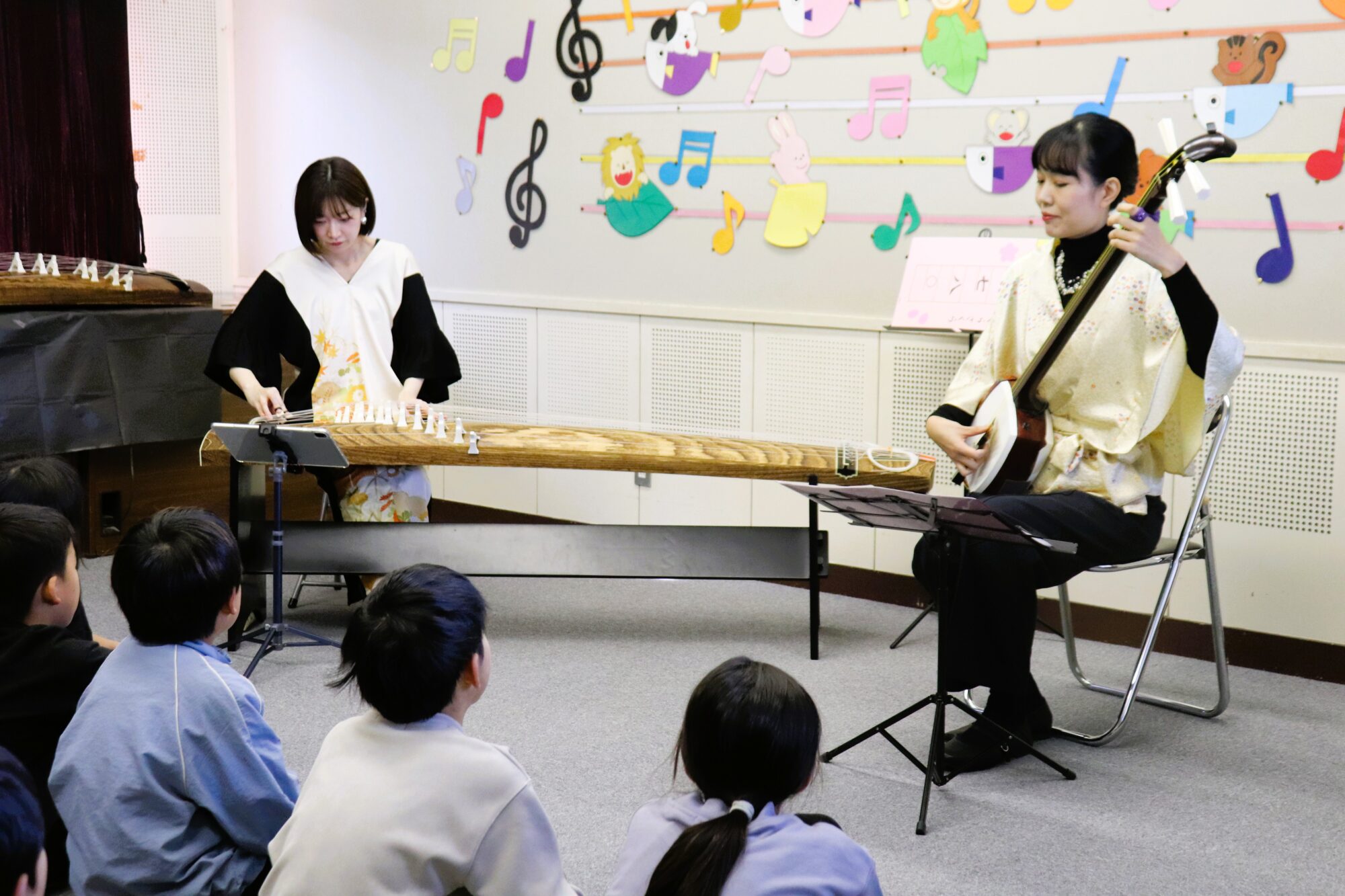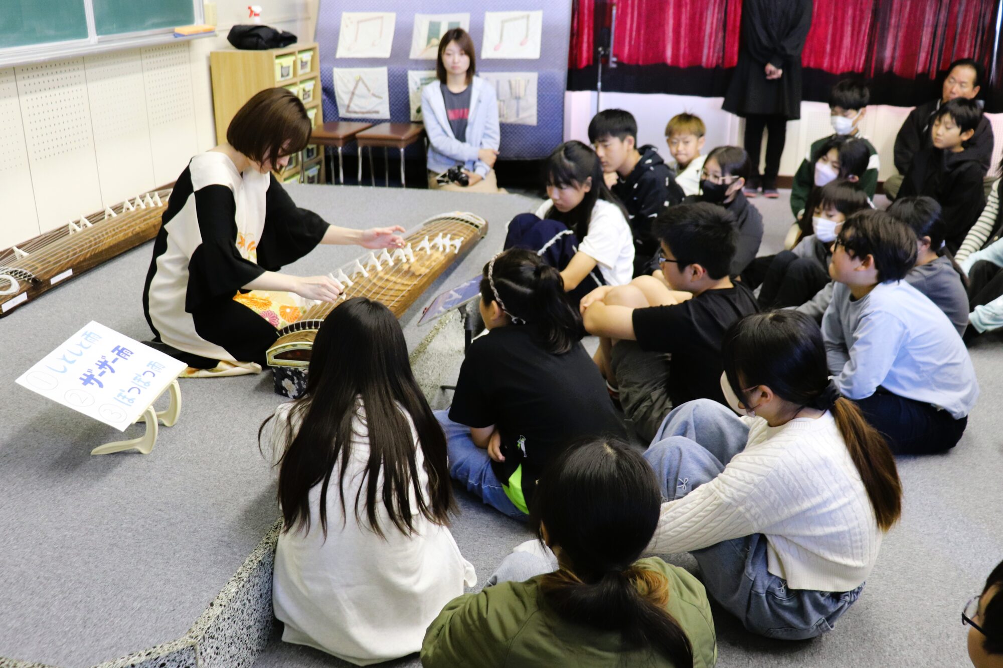 そして、箏と三味線の独奏をして、弾き方を見てもらったり、五線譜とは異なる和楽器の楽譜を見比べてもらいました。