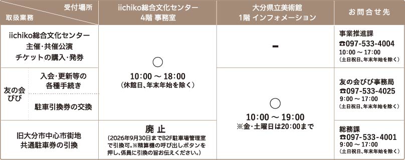 館内運営の見直しに伴い、iichiko総合文化センター インフォメーション(1階)は、2026年3月31日をもって廃止いたしました。これに伴い、2026年4月1日から、インフォメーションにおいて取り扱っていた業務は、下記の通り変更となります。