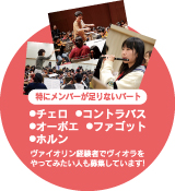| 団員資格 | 1.オーケストラをやってみたいと思う小学校3年生から20歳までの人 ※応募時年齢19歳まで。卒団後はOBとしての活動参加もあります。 2.オーケストラの一員としてすべての活動に積極的に参加し、 指定された練習日に出席でき、家庭でも毎日練習ができる人 3.活動に保護者の理解と協力が得られること |